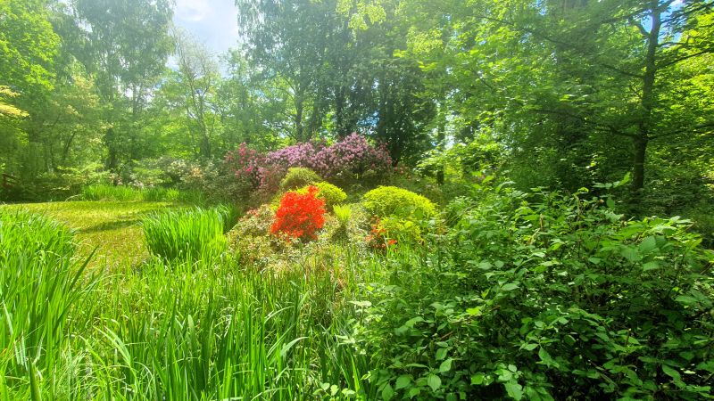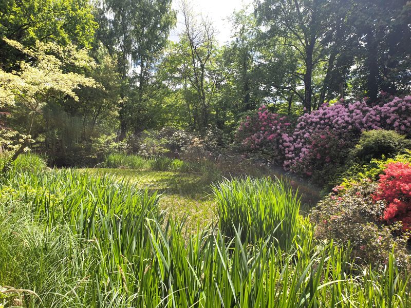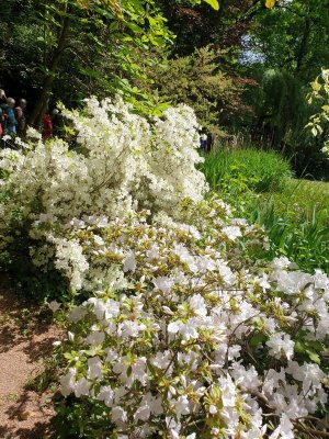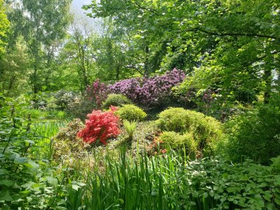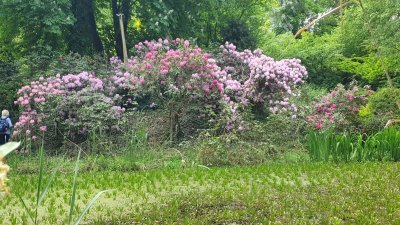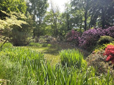 Der weite Landschaftspark, der als einer der größten Rhododendronparks Süddeutschlands gilt, ist wirklich beeindruckend! Highlights waren die vielen unterschiedlich angelegten Inseln in der Wasserlandschaft des Mühlweihers: Über verschlungene Wege gelangten wir auf die „Moorinsel“, die „Birkeninsel“, die „Theaterinsel“; vorbei an spiegelnden Wasserflächen und über romantische Brücken zu „Magnolieninsel“, „Bambusinsel“, „Lotusinsel“…