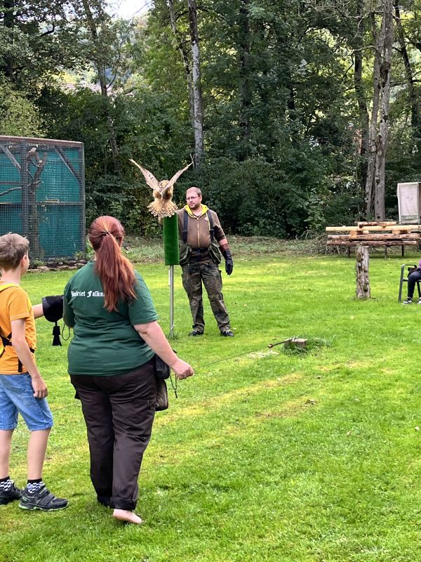 Den Kindern wurden Handschuhe gereicht, die sie anzogen um den kleinen Steinkauz Einstein auf die Hand zu nehmen. Er war bei den Kindern der Favorit. Auch der Waldkauz, der Wüstenbussard und die Eulen wurden uns gezeigt. Fatzke, der Uhu, welcher zuerst keine große Lust hatte aus seiner Behausung zu uns zu fliegen, entschloss sich jedoch nach einigem Zögern und mit einigen Leckerbissen angelockt, uns seine Künste im Anflug zu präsentieren.